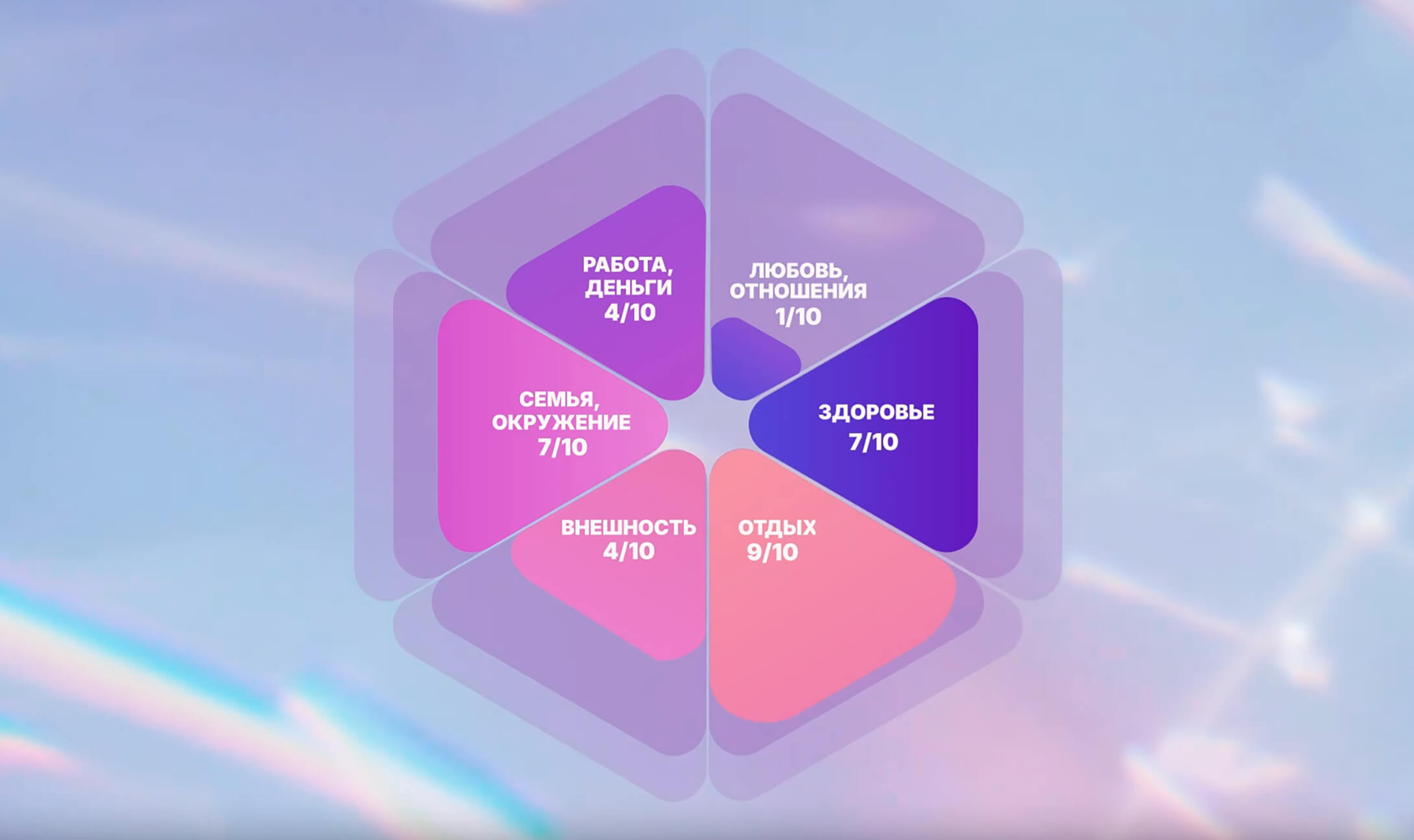 Психолог Виктория Дмитриева использует этот метод, помогая участницам проекта «Новый день» осознать, какие аспекты их жизни нуждаются в поддержке, и как найти путь к гармонии и новому началу. Колесо баланса от Виктории Дмитриевой включает шесть сфер, отражающих ключевые области человеческой жизни. Вы можете адаптировать его под себя. Например, если для вашей гармонии важны сферы хобби, саморазвития или дружбы, вы можете добавить их в колесо баланса, либо исключить те сферы, которые для вас неактуальны.
