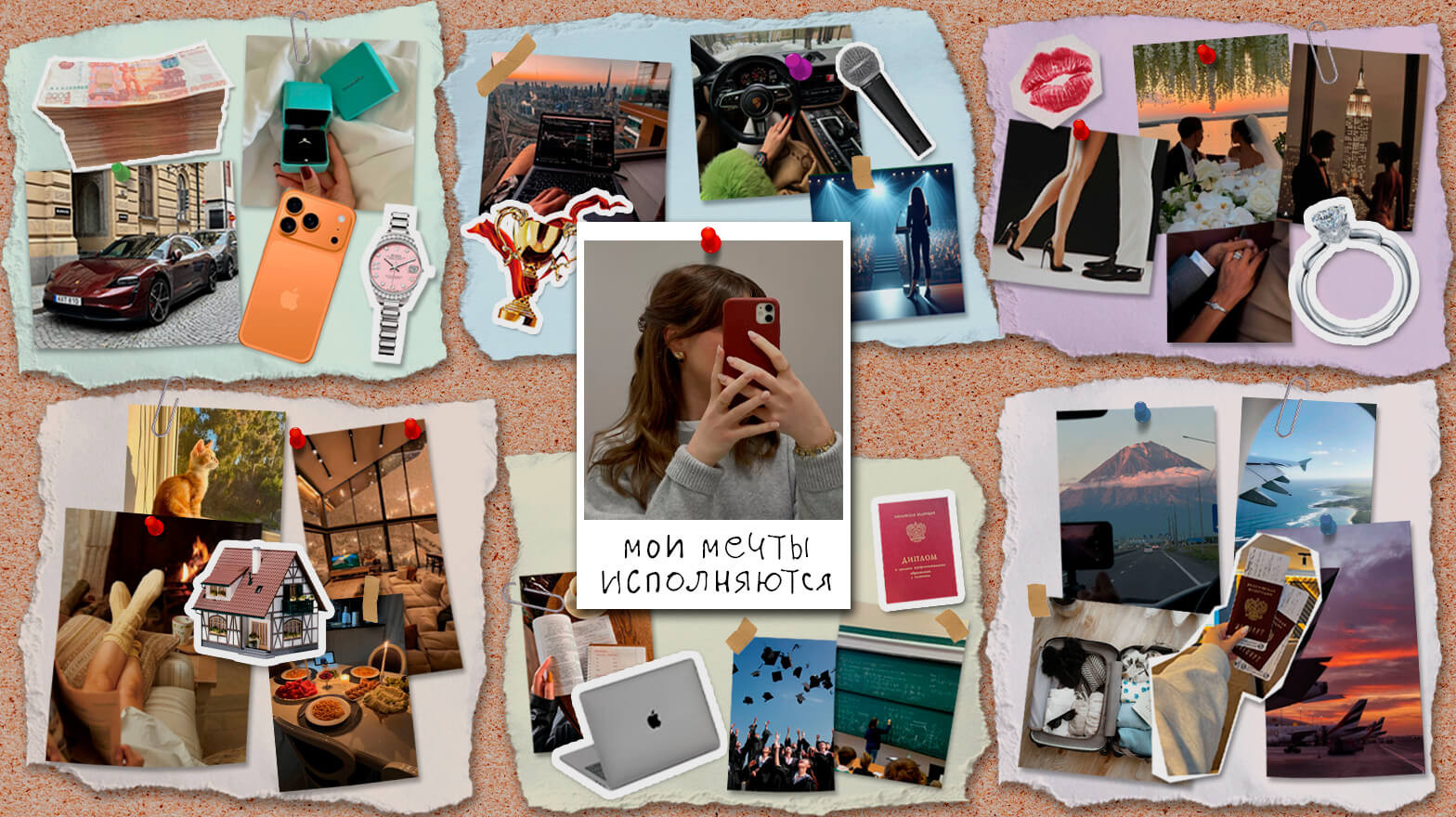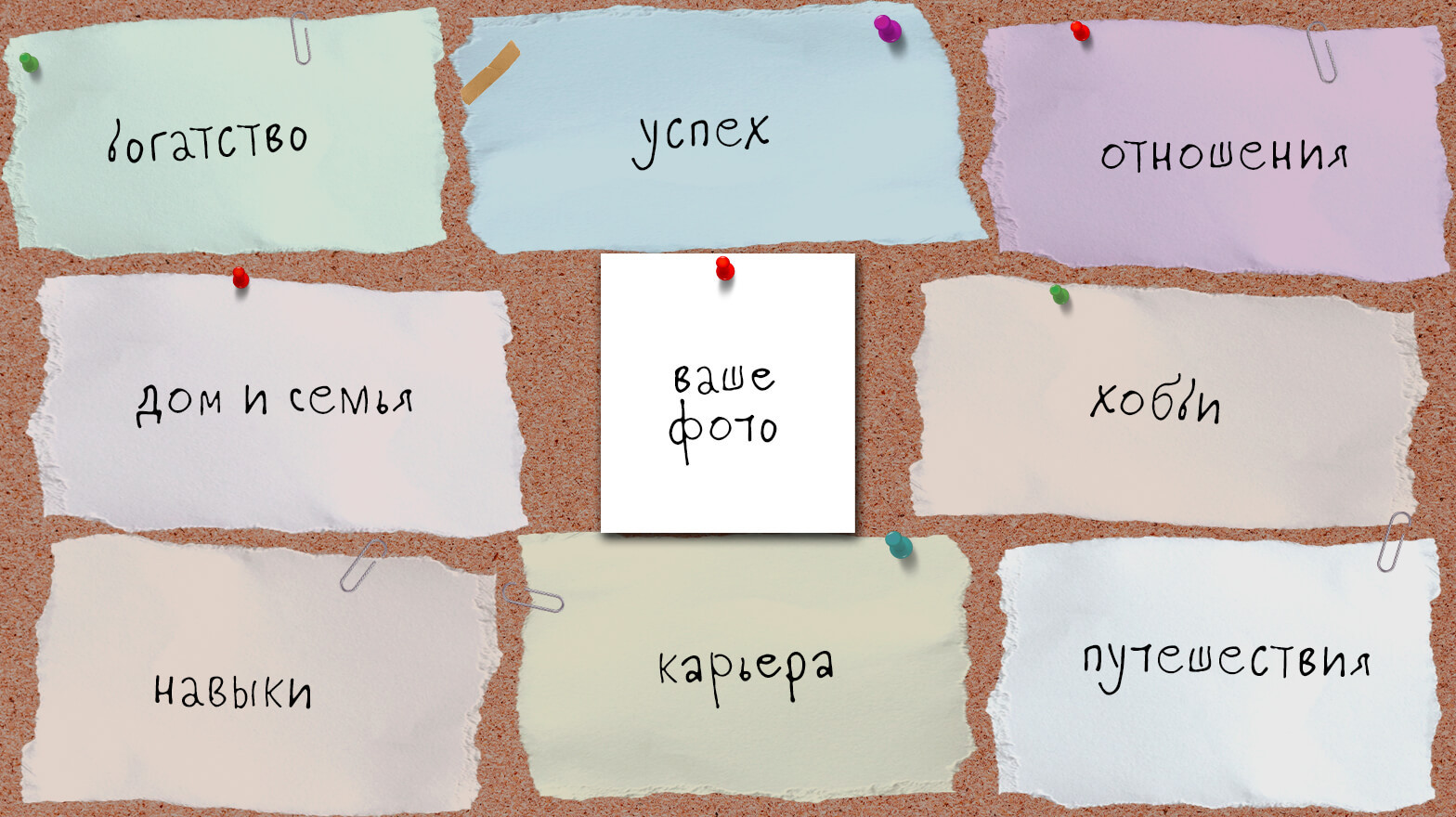 Карта желаний — это визуальное представление ваших целей и мечт. На ней вы размещаете изображения, которые отражают то, что хотите притянуть в свою жизнь: любовь, путешествия, карьеру, гармонию. Это инструмент, основанный на визуализации: когда мы постоянно видим перед собой стимулы, мозг воспринимает их как реальные ориентиры и начинает искать пути к их достижению.