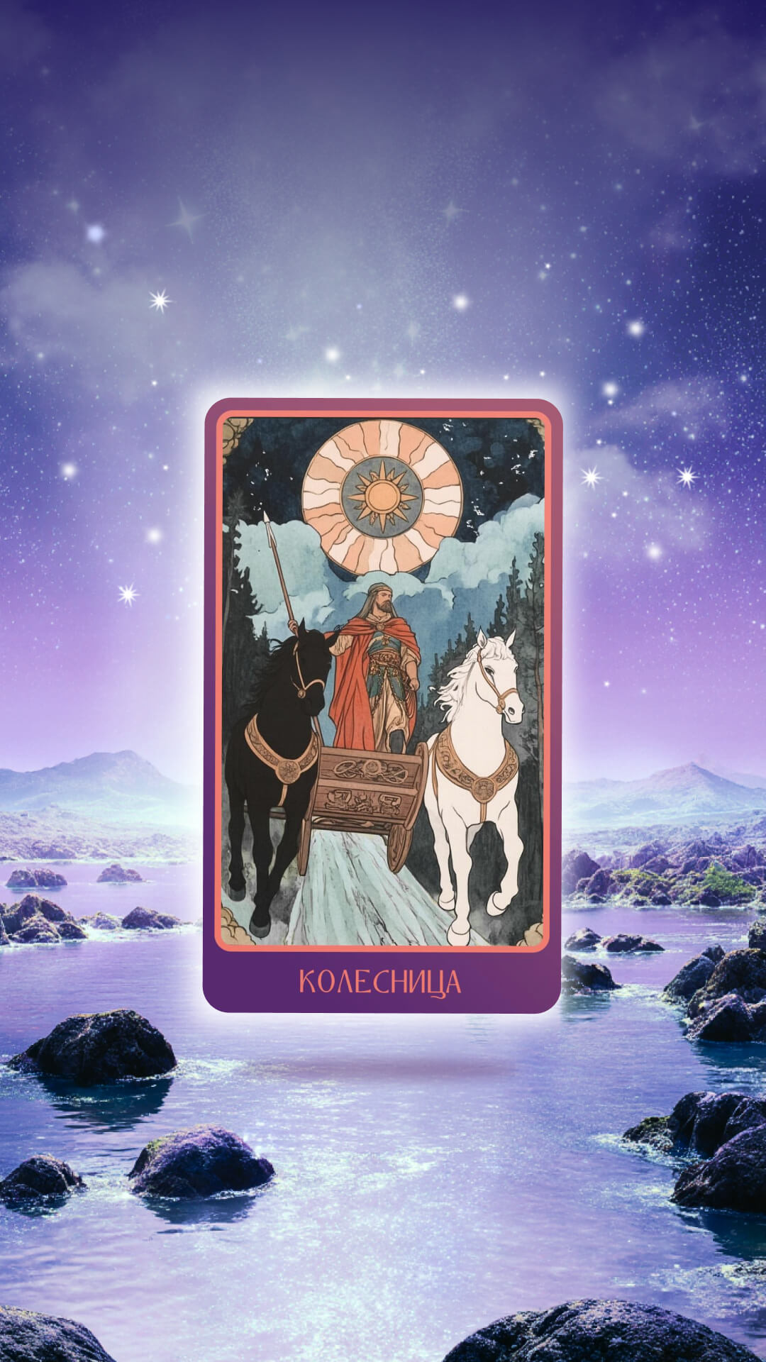Карта Колесница — хороший вариант для тех, кому не хватает мотивации и целеустремлённости. Этот аркан символизирует волю, дисциплину и энергию, которые помогают собраться и двигаться к цели. В роли заставки на телефон Колесница помогает справиться с сомнениями и придаёт смелость.