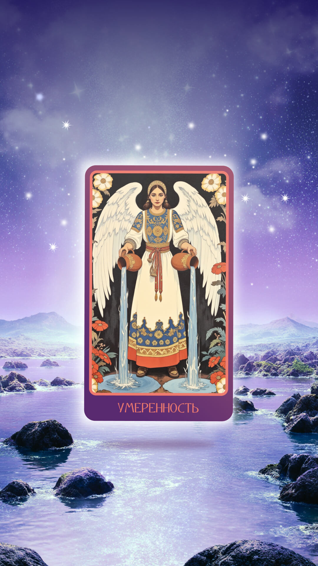 Карта Умеренность — подходящий вариант для тех, кому не хватает спокойствия и гармонии. Аркан символизирует баланс и умение находить золотую середину. Она учит мягко контролировать разные сферы жизни и помогает исключить стресс. В роли заставки на телефоне Умеренность напоминает о том, что не стоит перегружать себя и можно находить счастье и покой в простых вещах.