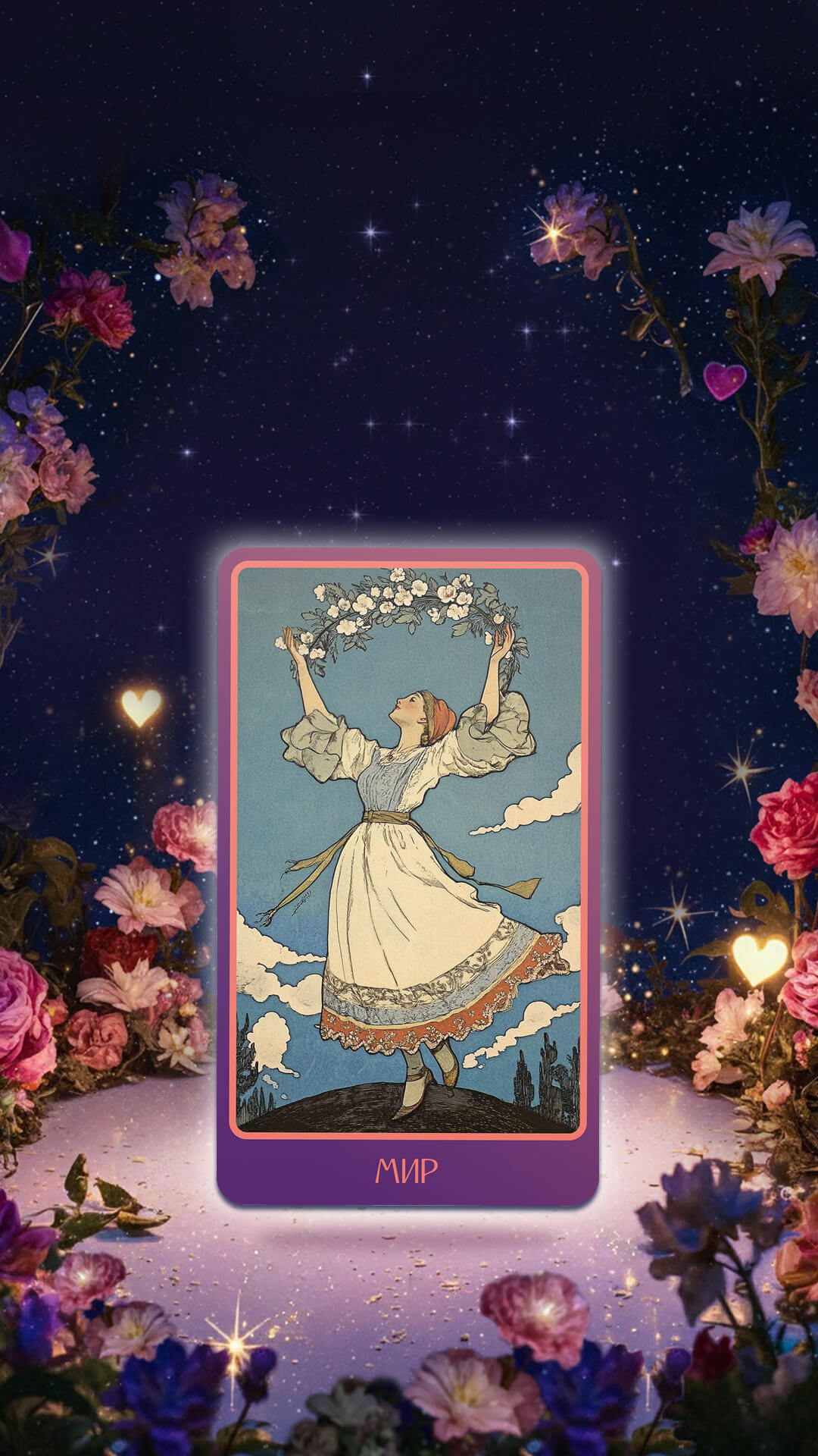 Карта Мир подойдёт тем, кто хочет помириться со своим партнёром или минимизировать ссоры в отношениях. Аркан символизирует завершение трудностей, целостность, гармонию, а также переход на новый уровень. Карта помогает достичь в отношениях спокойствия и взаимопонимания. В качестве заставки на телефон Мир поможет вернуть доверие и сделать союз крепче.