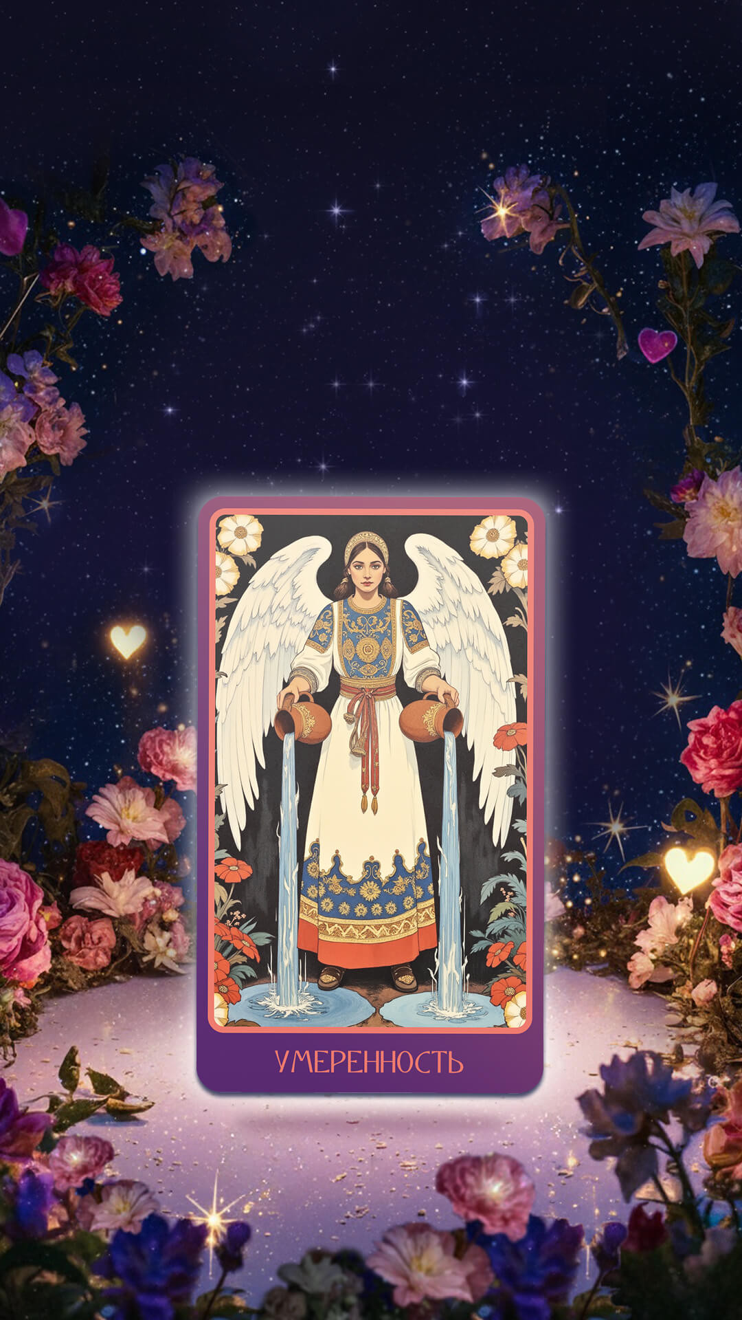 Умеренность — карта гармонии и компромисса, учит находить баланс и договариваться. В качестве заставки она помогает услышать друг друга, поддержать мир в паре и разрешить конфликты. Это отличный выбор, если нужно вернуть спокойствие в общение. Карта помогает партнёрам избегать крайностей, что особенно важно для длительных отношений.